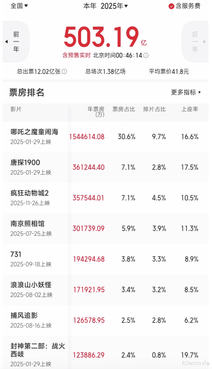可今年因《哪吒2》飙升到了160.92亿,从3月份到暑期档之间的档期又全靠《哪吒2》撑着。